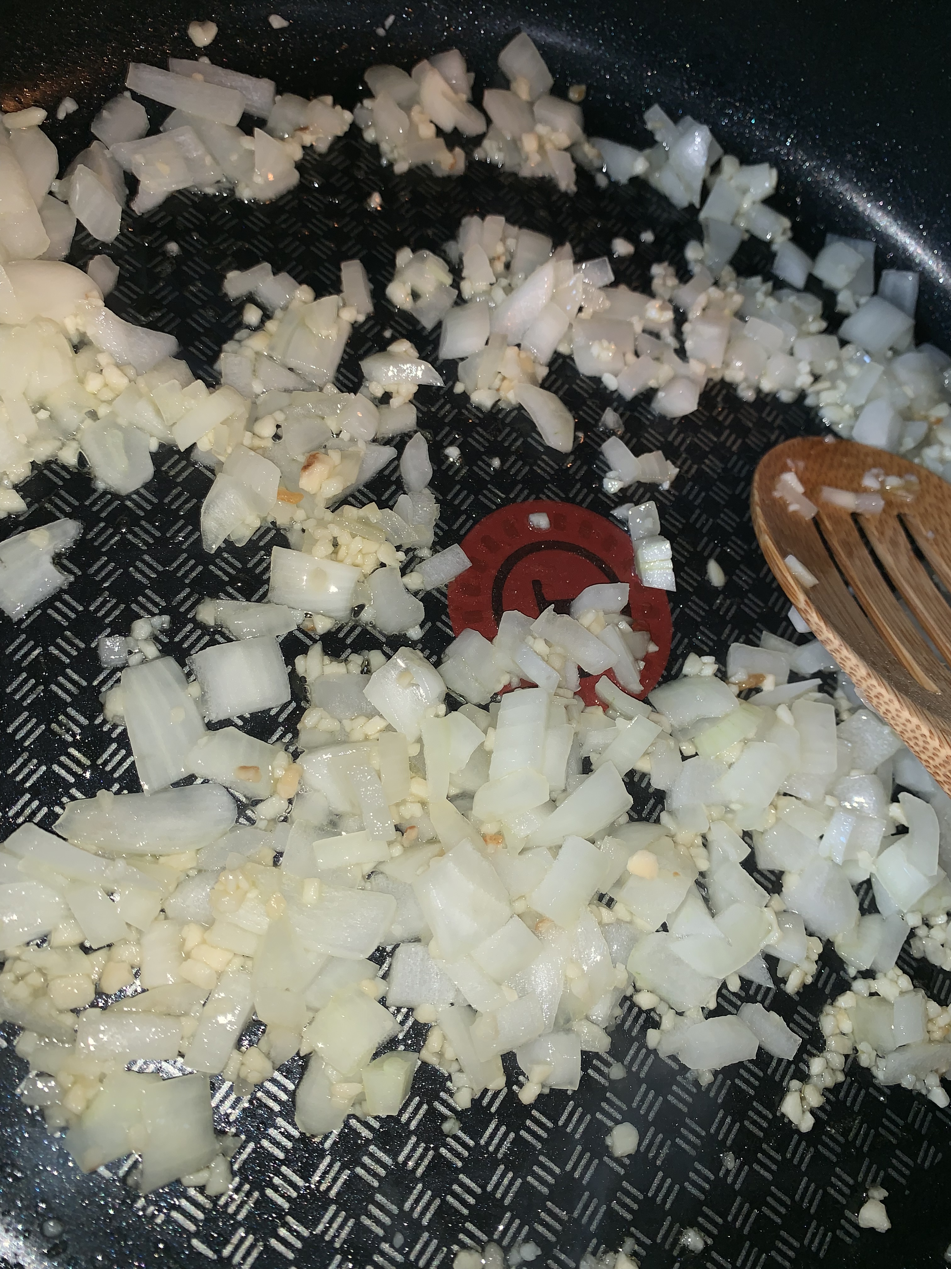 - In hot pan, add olive oil, onion and garlic – cook until onions are translucent