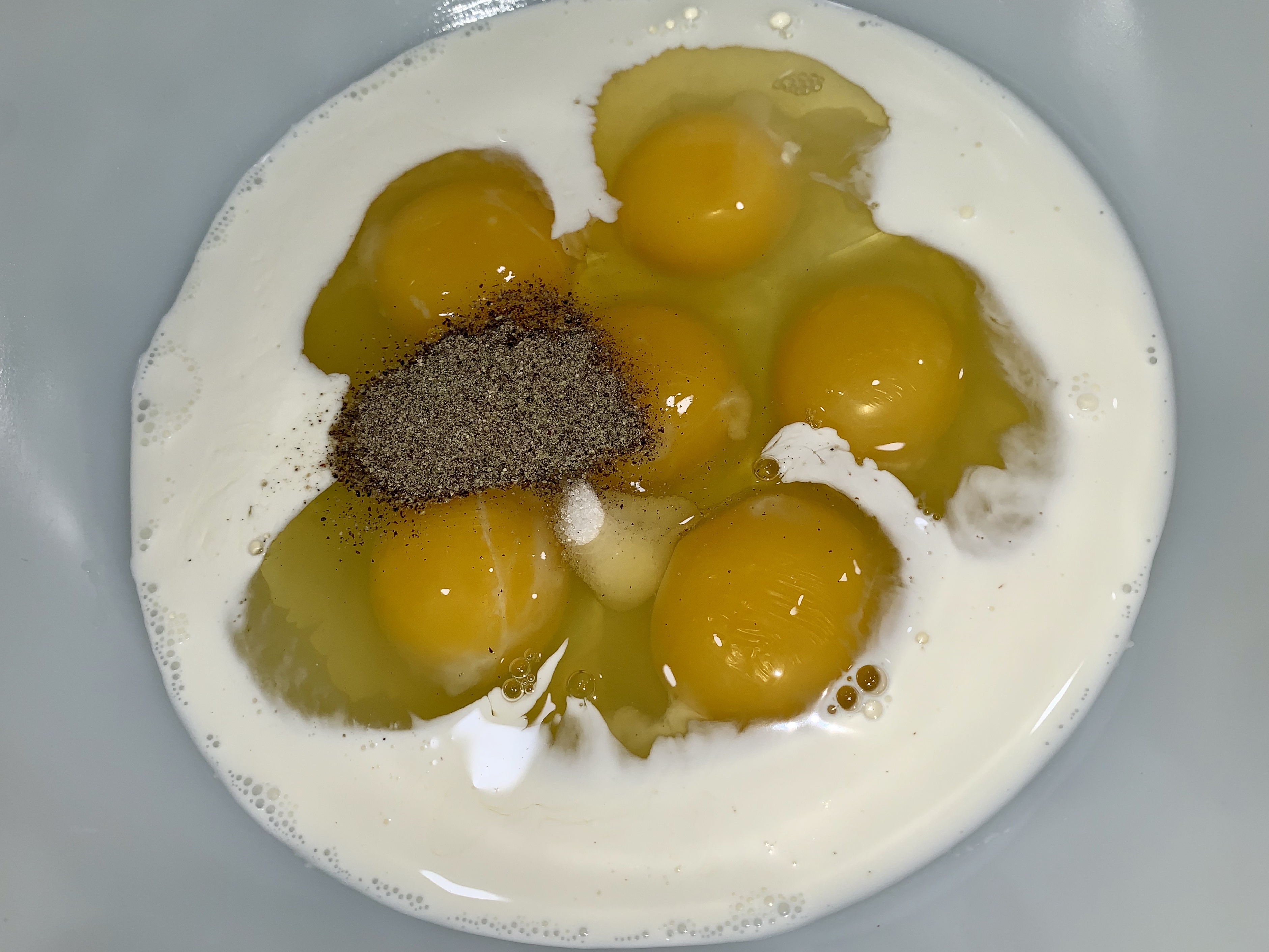 - In large bowl, whisk eggs, heavy cream, salt and pepper