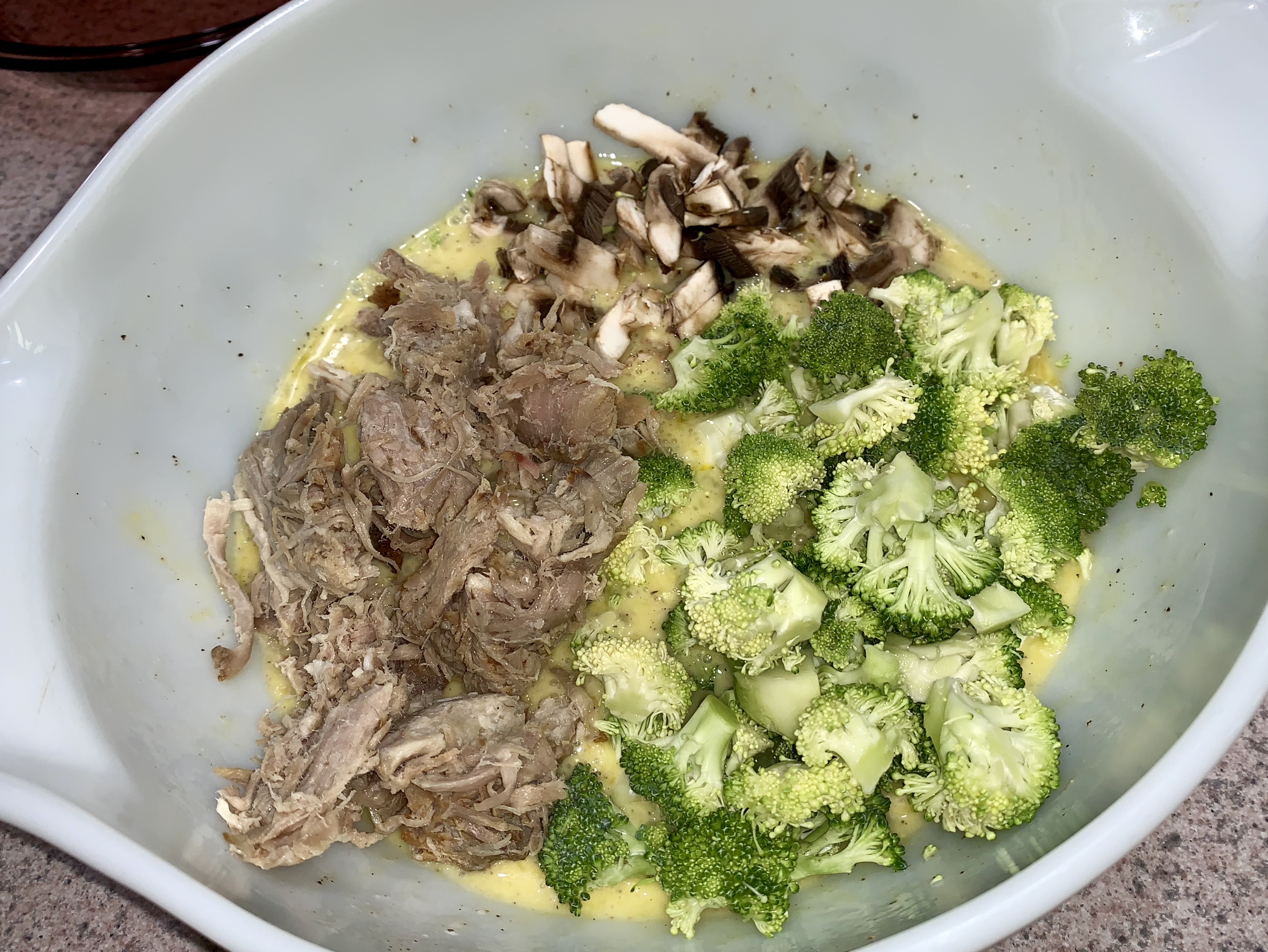 As usually happens with frittatas, I started looking to see which vegetables I had left in the fridge. I ended up with some broccoli (from when I made Chicken and Broccoli Alfredo, last week) and mushrooms (from when I made Stuffed Bell Peppers) – and I thought those would work nicely with the pork. Add that with some monterey jack cheese and we were good to go!