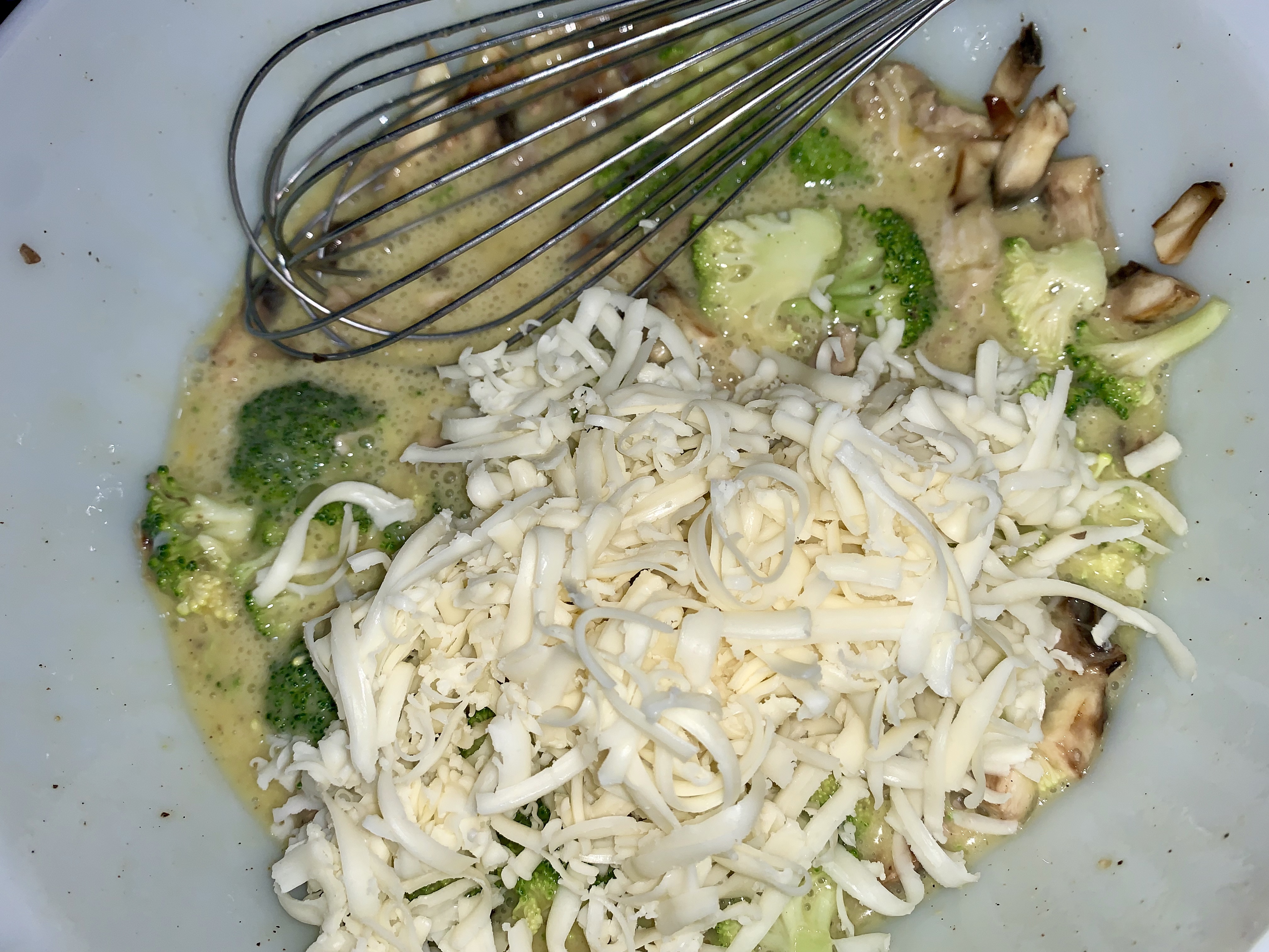 Finally, I added in 3/4 cup of cheese (I held 1/4 cup to put on top of frittata) and mixed it all up.