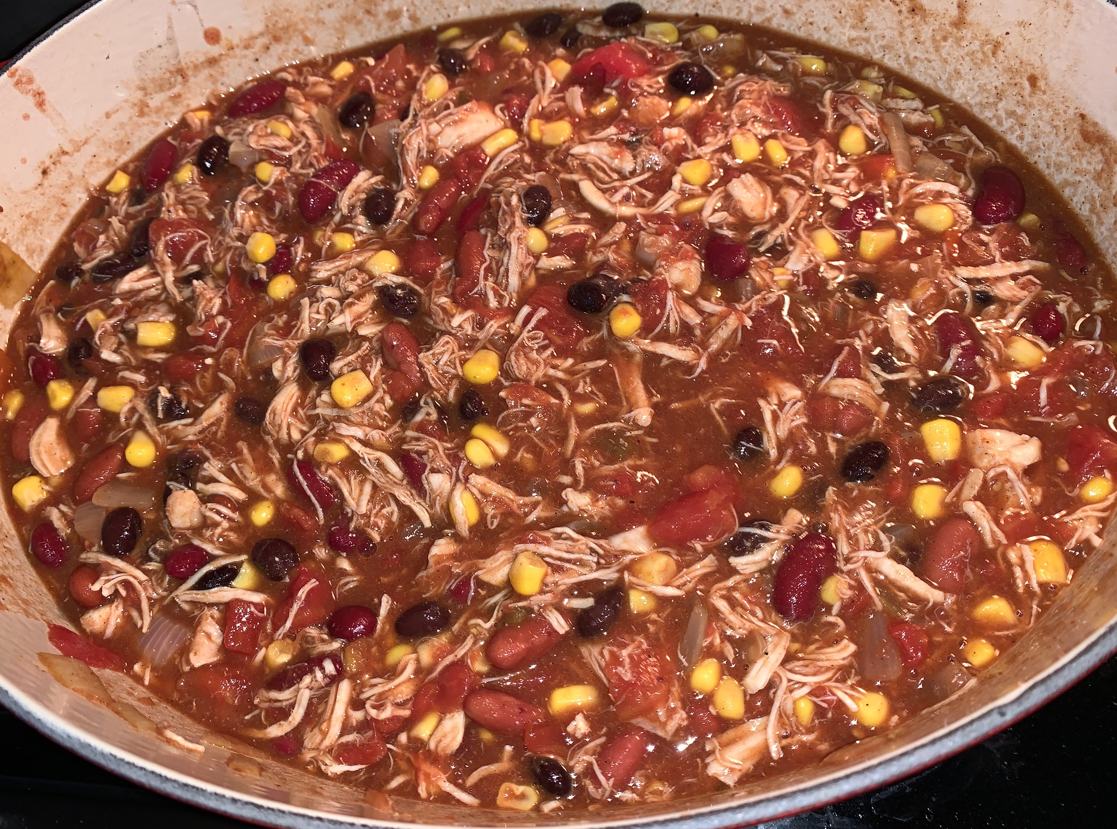 • Add in shredded chicken (I cooked my chicken in the instant pot, with approx 1 cup of chicken stock – I added it all into the dutch oven, including the stock) and stir