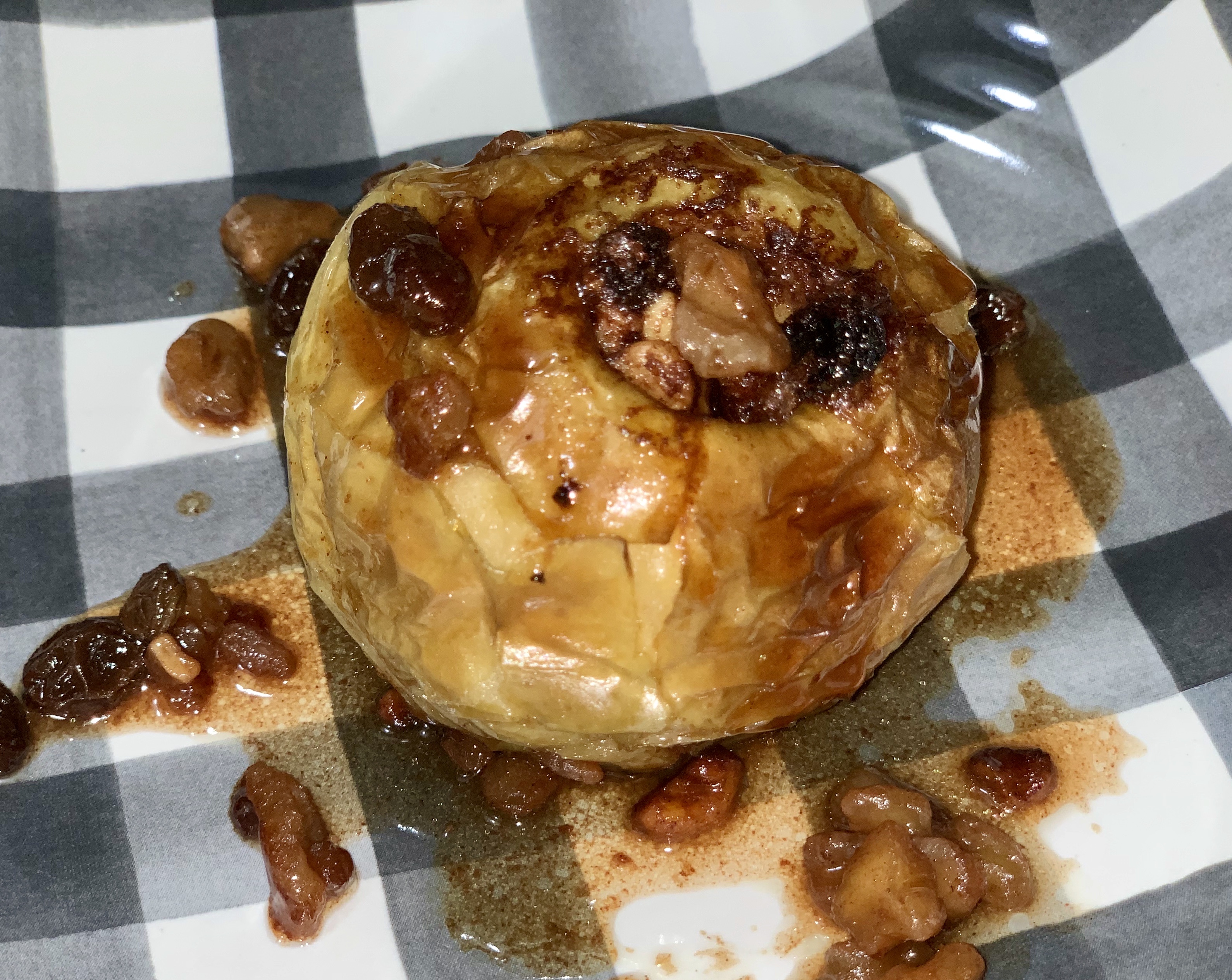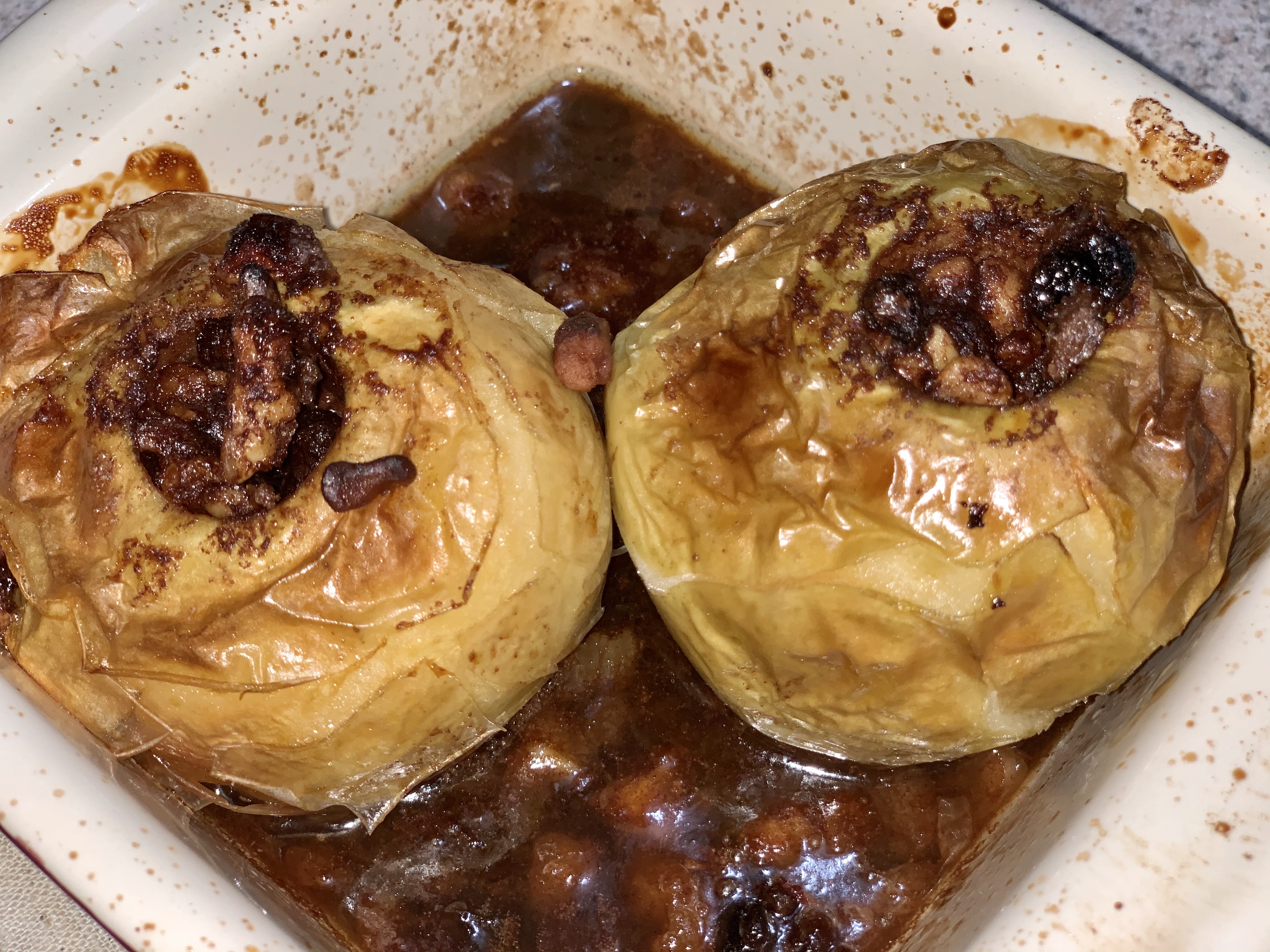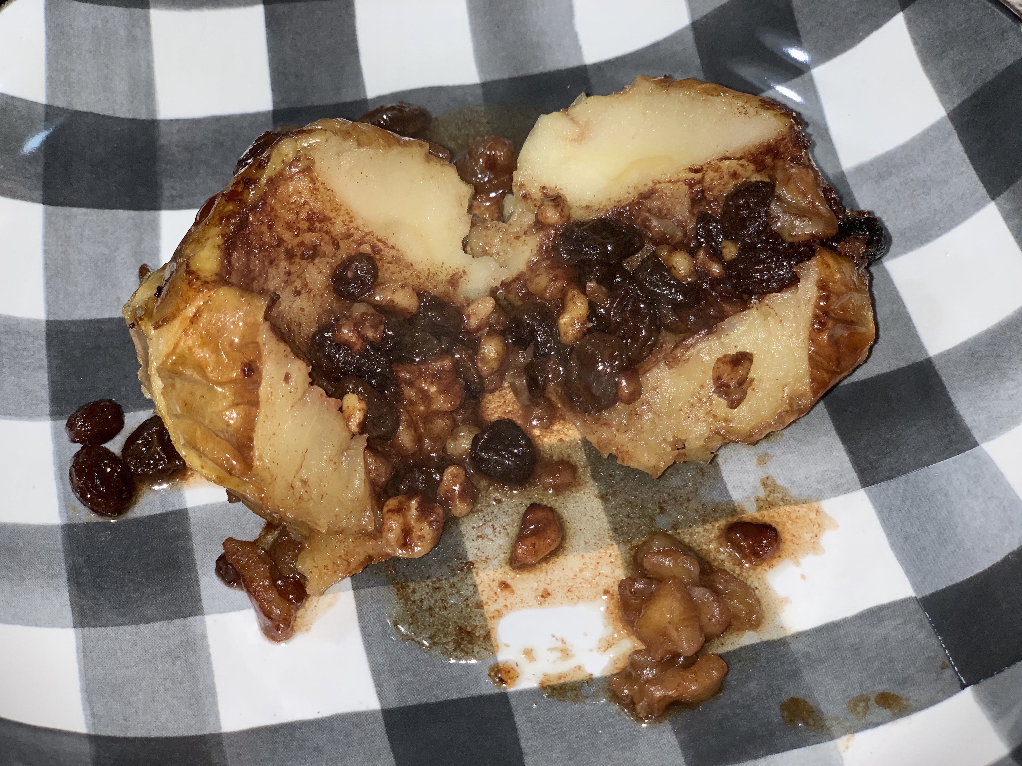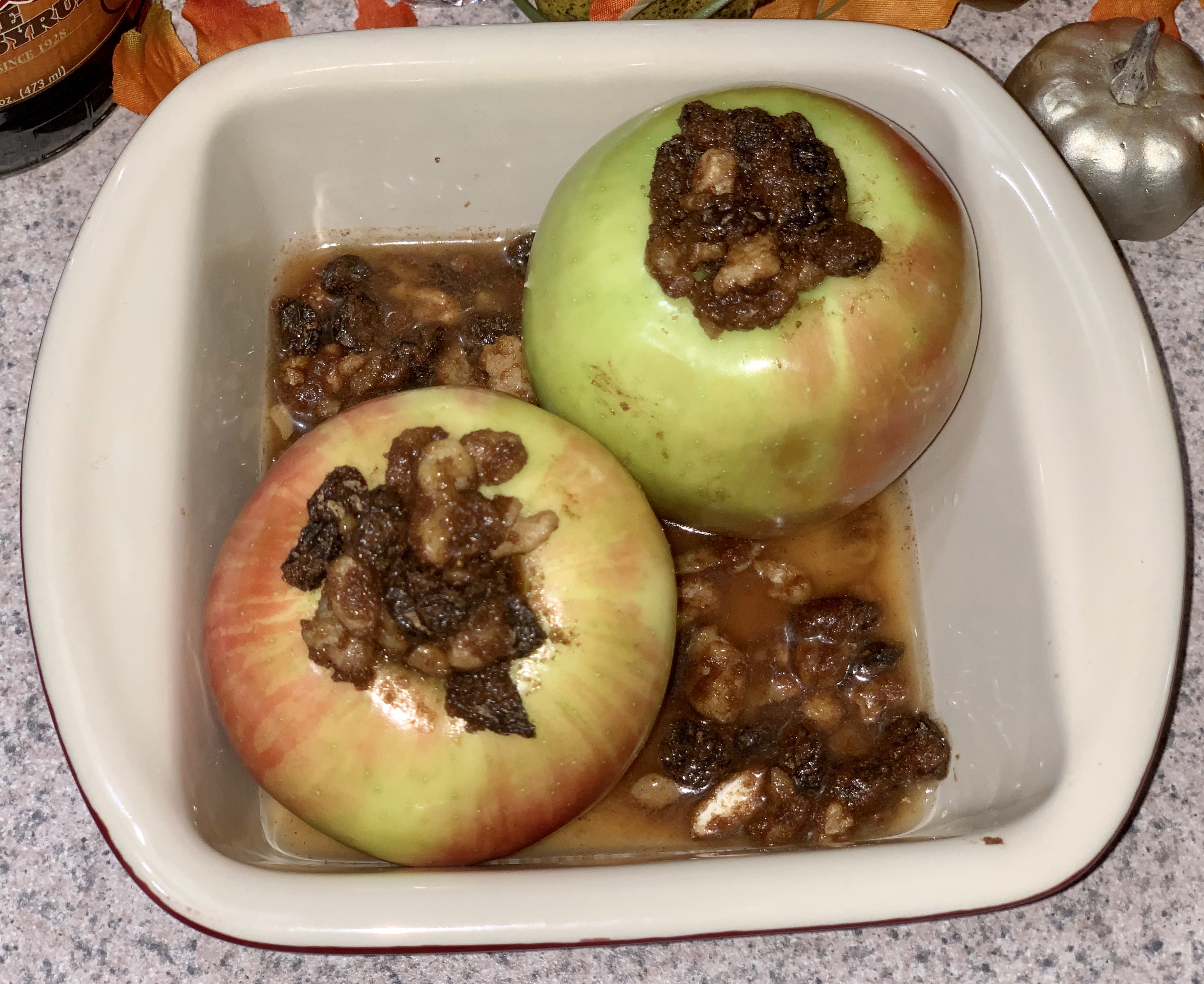 I’m home, mostly (I think a teenager holed up, upstairs, doesn’t really count as being home when me. I barely see her!), alone, so I decided to just bake 2 apples. If you choose to do more, just double, triple, whatever the ‘stuffing’ ingredients.