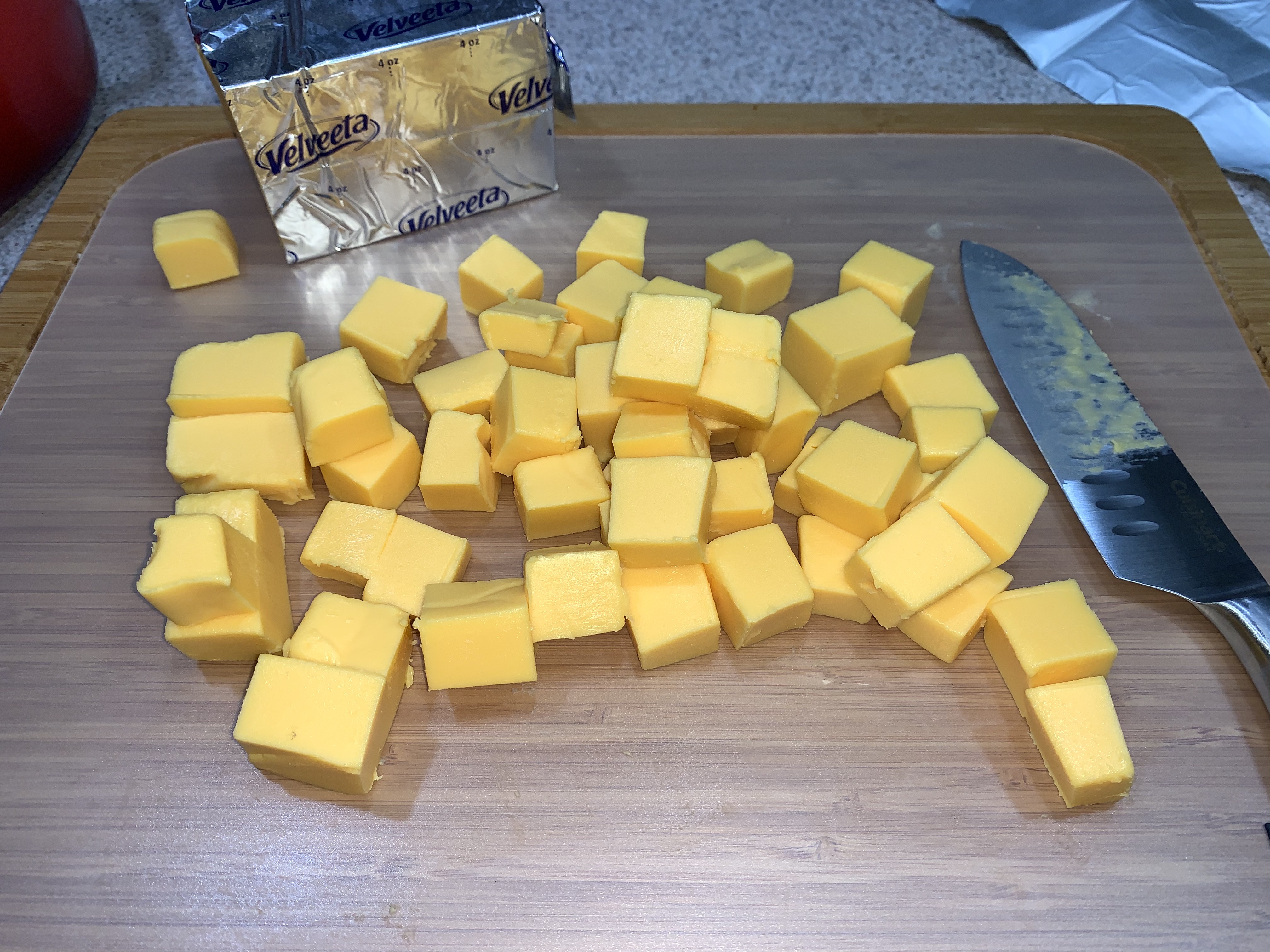 I wasn’t making this for a big group, so I only used 1/2 of the 32 oz block. I just cut the cheese (we will pretend it is cheese, even though it will presumably survive anything in it’s shelf stable form!) into small cubes.