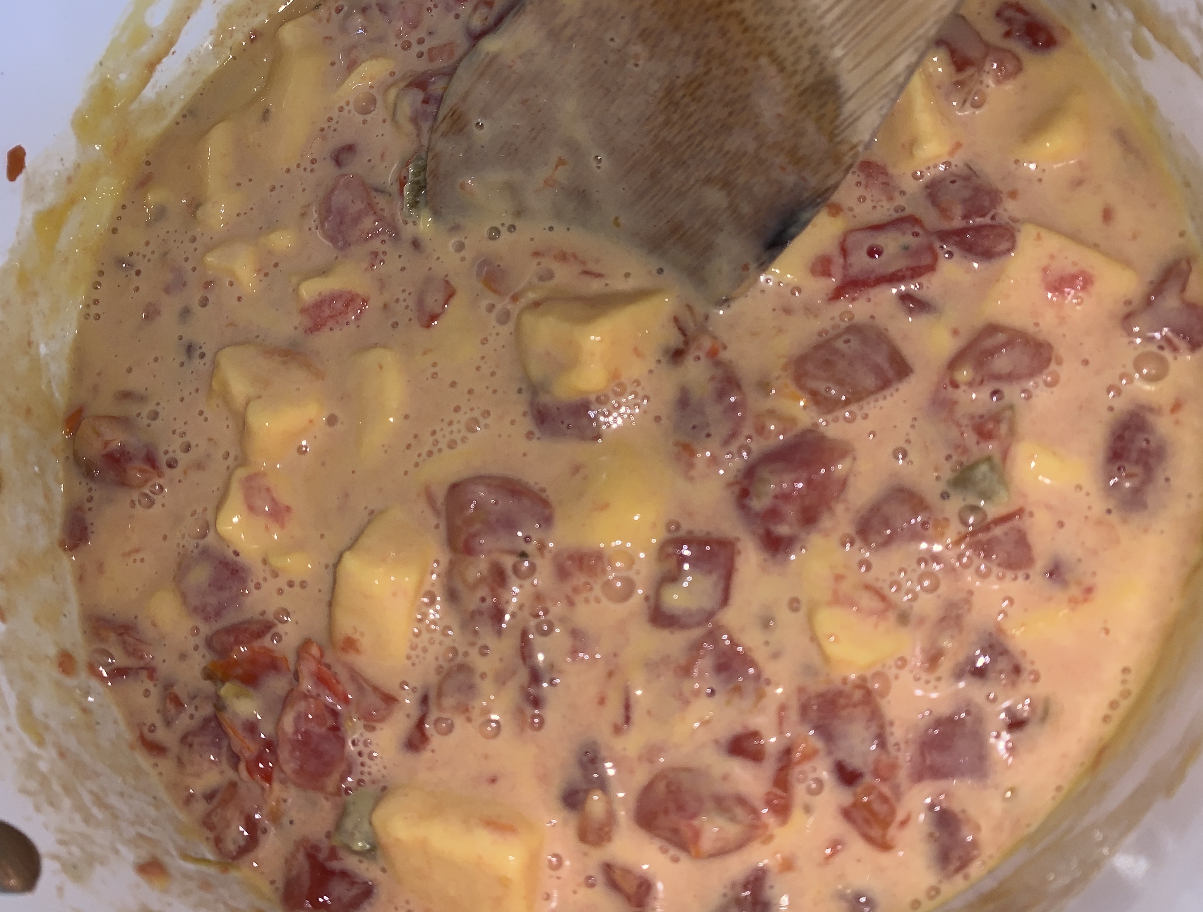 I just added the cheese to a sauce pan, along when the can of tomatoes and chili’s (don’t drain!). Over medium heat (you don’t want it too hot or it will scorch – be patient, it won’t take long!!), I allowed the cheese to melt. And kept it all stirred together.