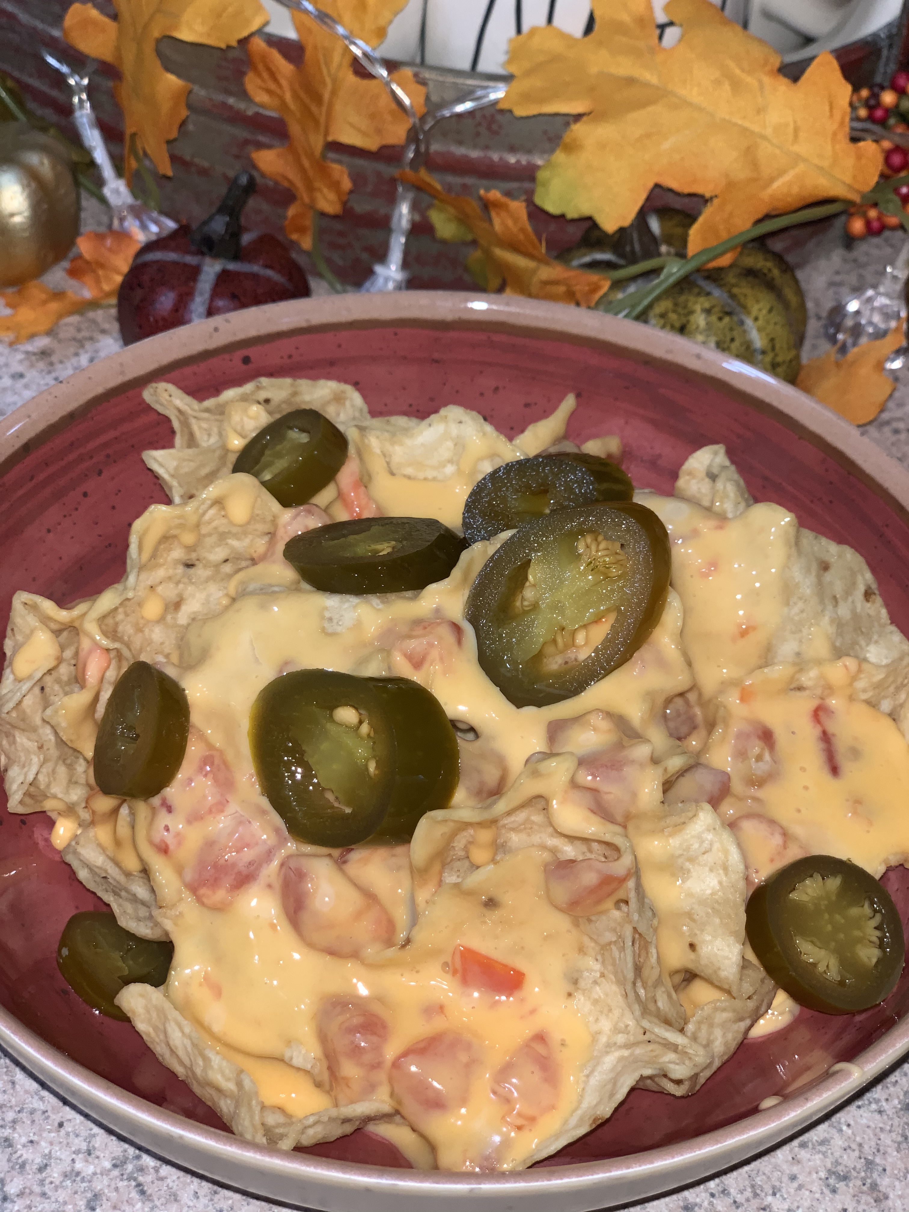 Once the cheese was good and melted, I spooked some over some tortilla chips and topped with some jalapeño peppers. You can do it like this, to make nachos (I wanted simple nachos – but you can add other toppings if you want!) or just dip your chips in the queso dip.