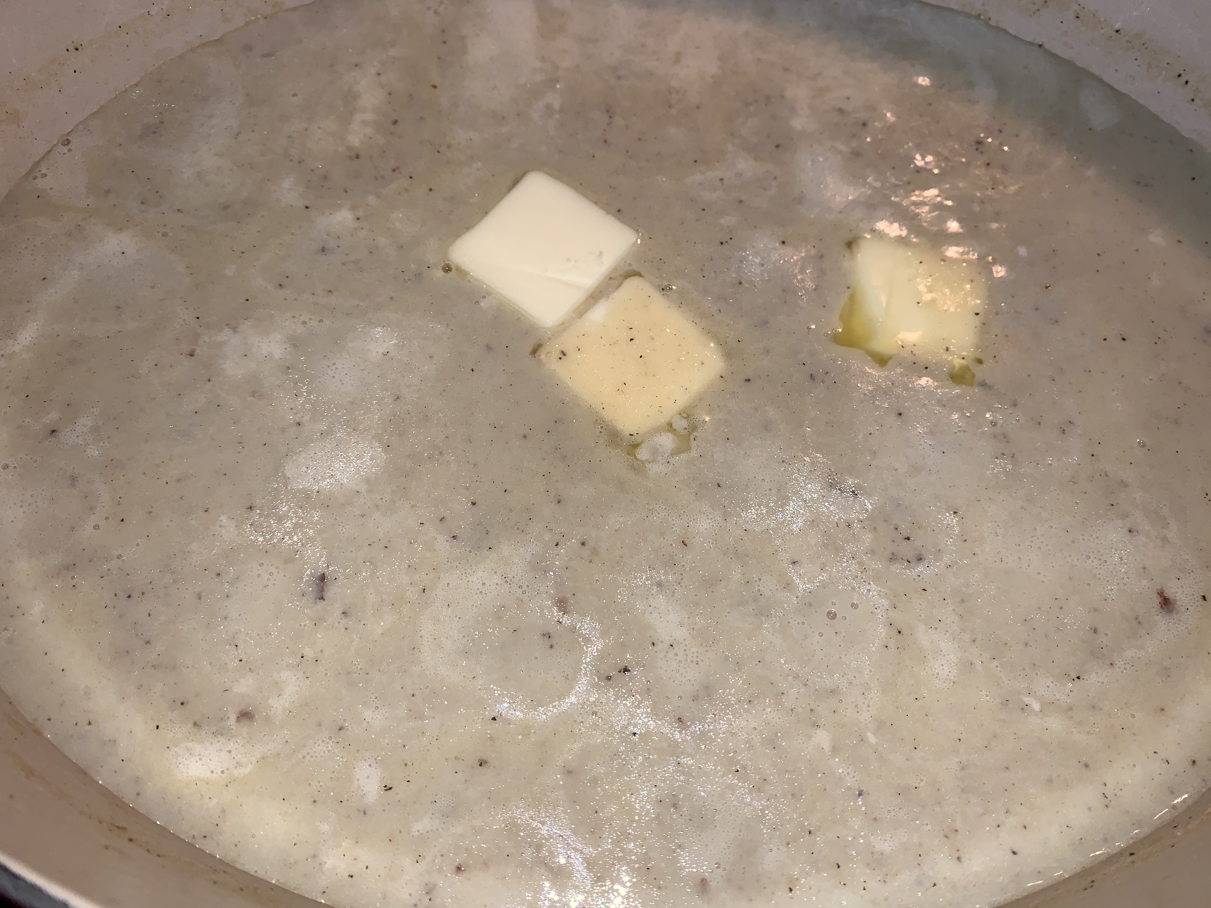 After the roux was done, I added in the chicken stock. This was the time that I was able to deglaze the dutch oven. I stirred the mixture through and let the roux combine with the chicken stock, prior to adding in the milk. And, finally the potatoes. Once it was all warmed through, I added in the salt, pepper and butter. I turned down the heat (because my dutch oven holds heat so well, I can’t have it up too high or it will boil over), covered the dutch oven and cooked the soup for about 30 minutes – stirring occasionally.