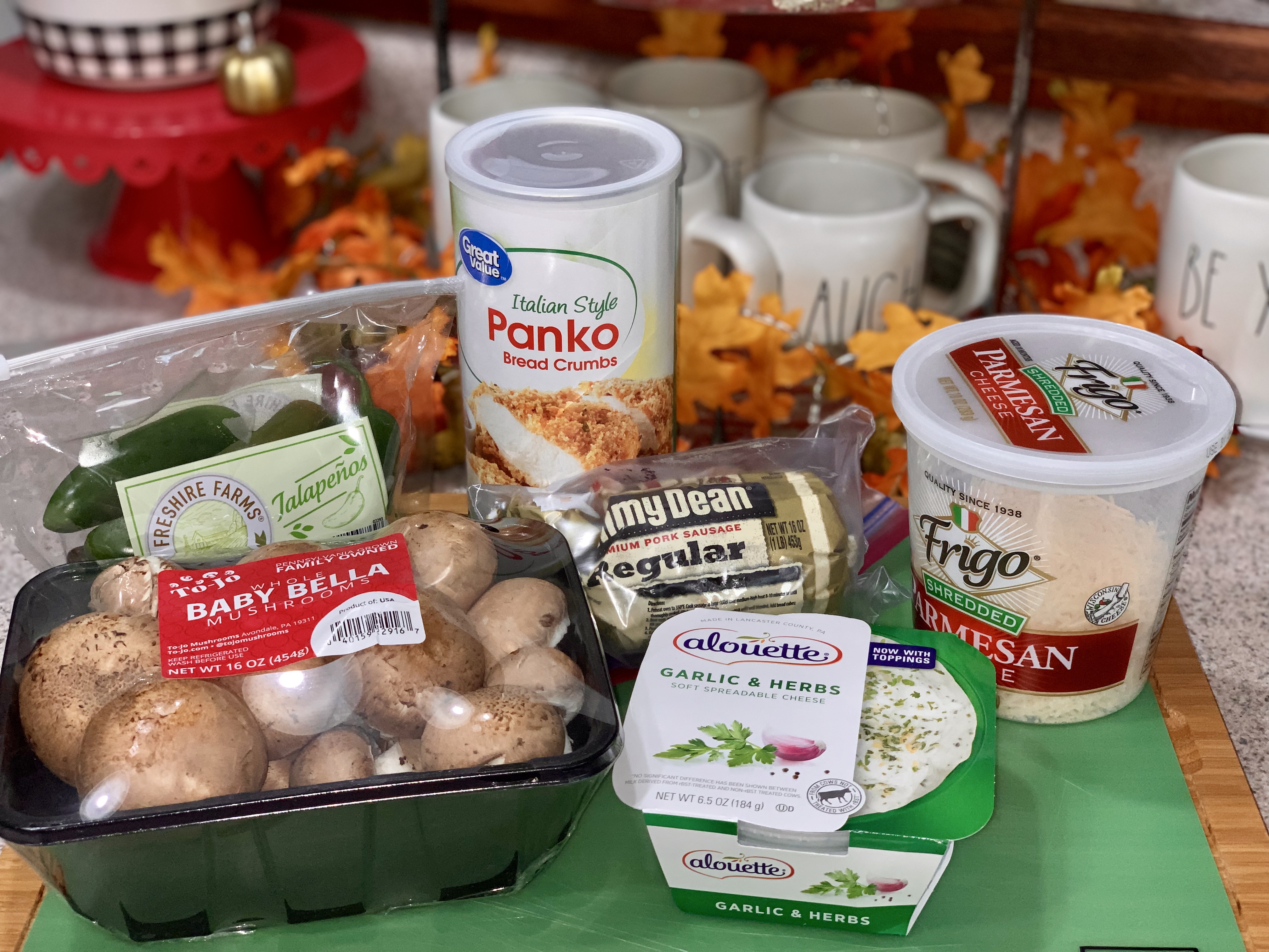 Stuffing 1/2 chub sausage (I used Jimmy Dean) 4 tbsp Alouette Garlic and Herbs Soft Spreadable Cheese 3 tbsp grated parmesan 1/2 cup Italian Panko Crumbs Mushroom stems, finely chopped 1 small seeded jalapeño, finely chopped 1/2 tbsp garlic