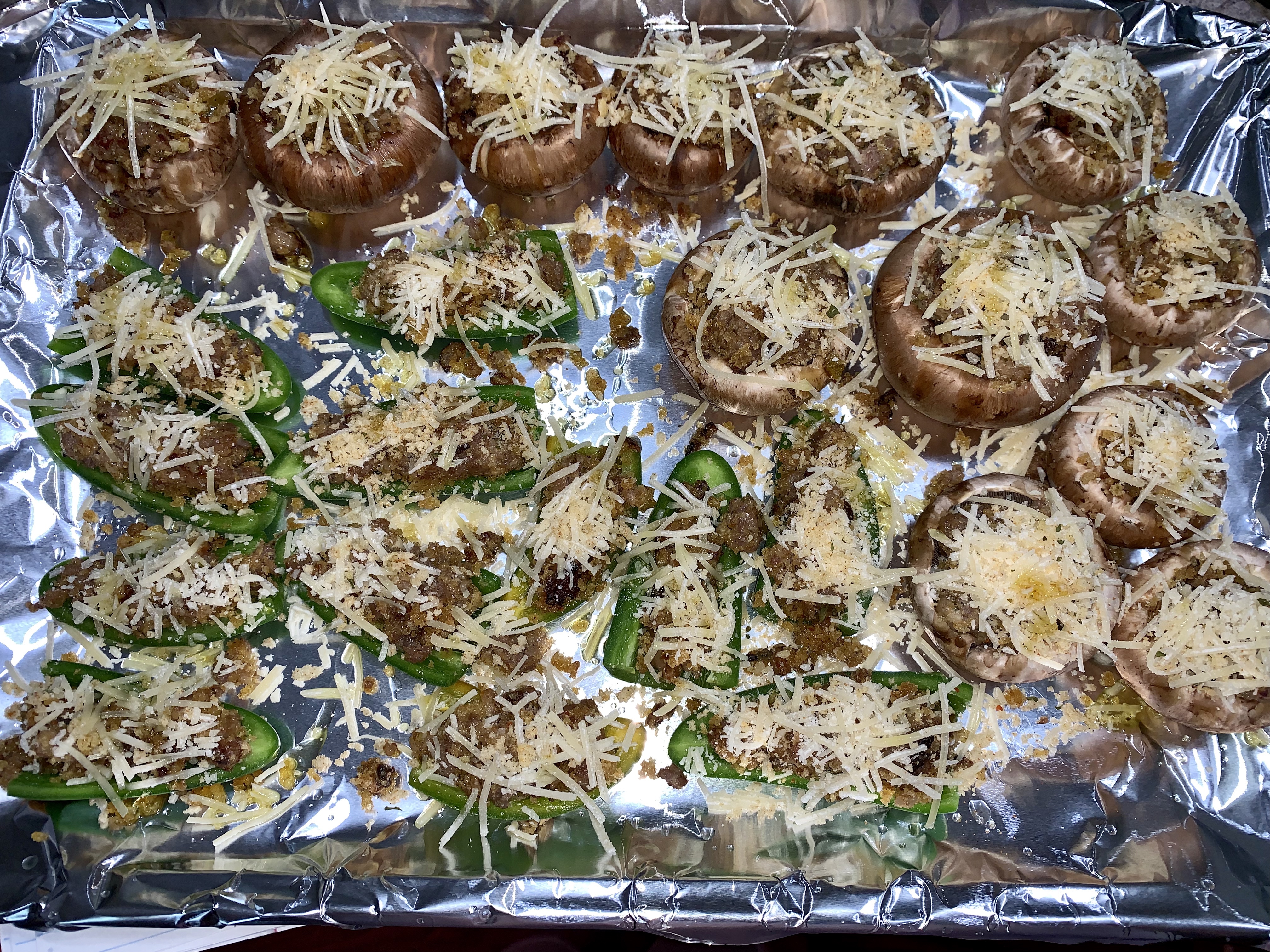 The next step is to stuff the mushrooms and jalapeños with the stuffing, top with a little more parmesan and bread crumbs – finally, drizzle with olive oil and into the oven the go!