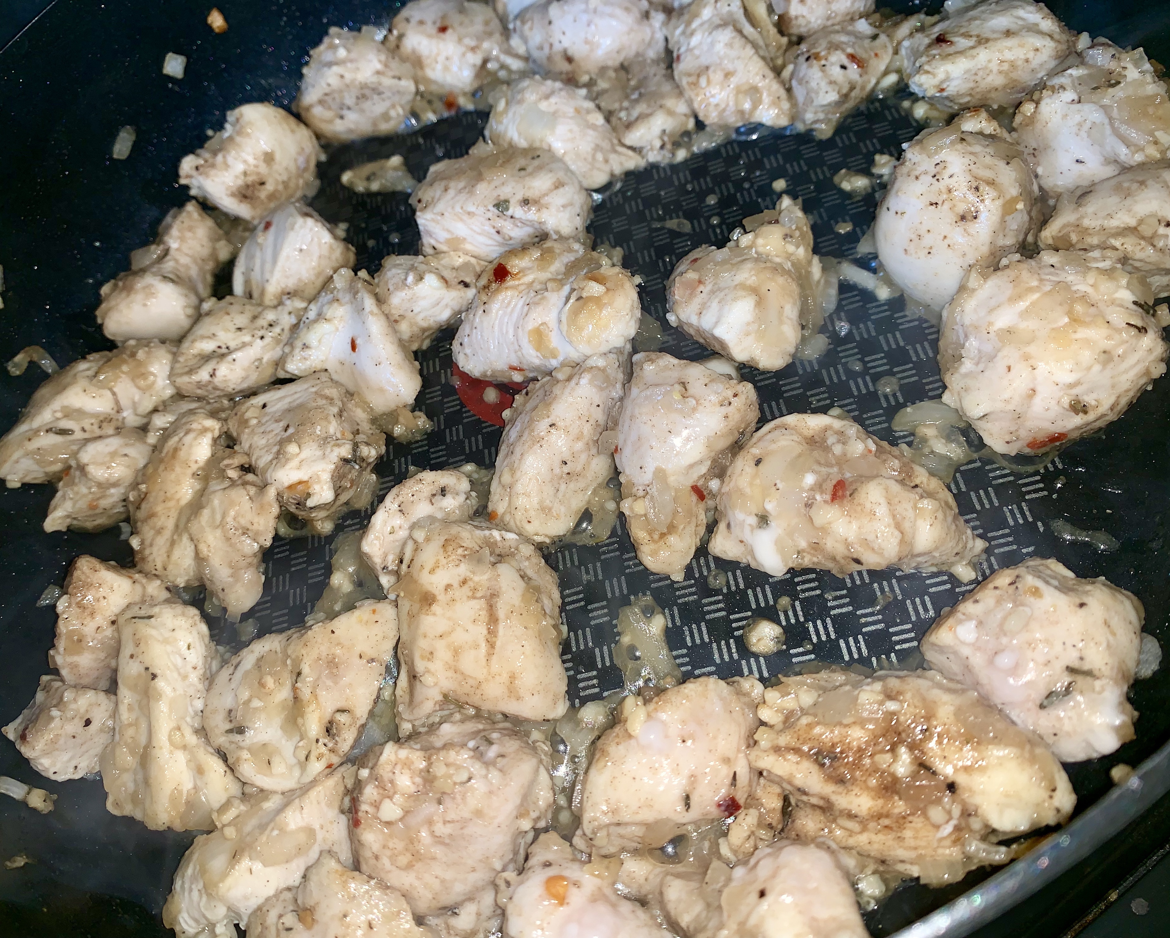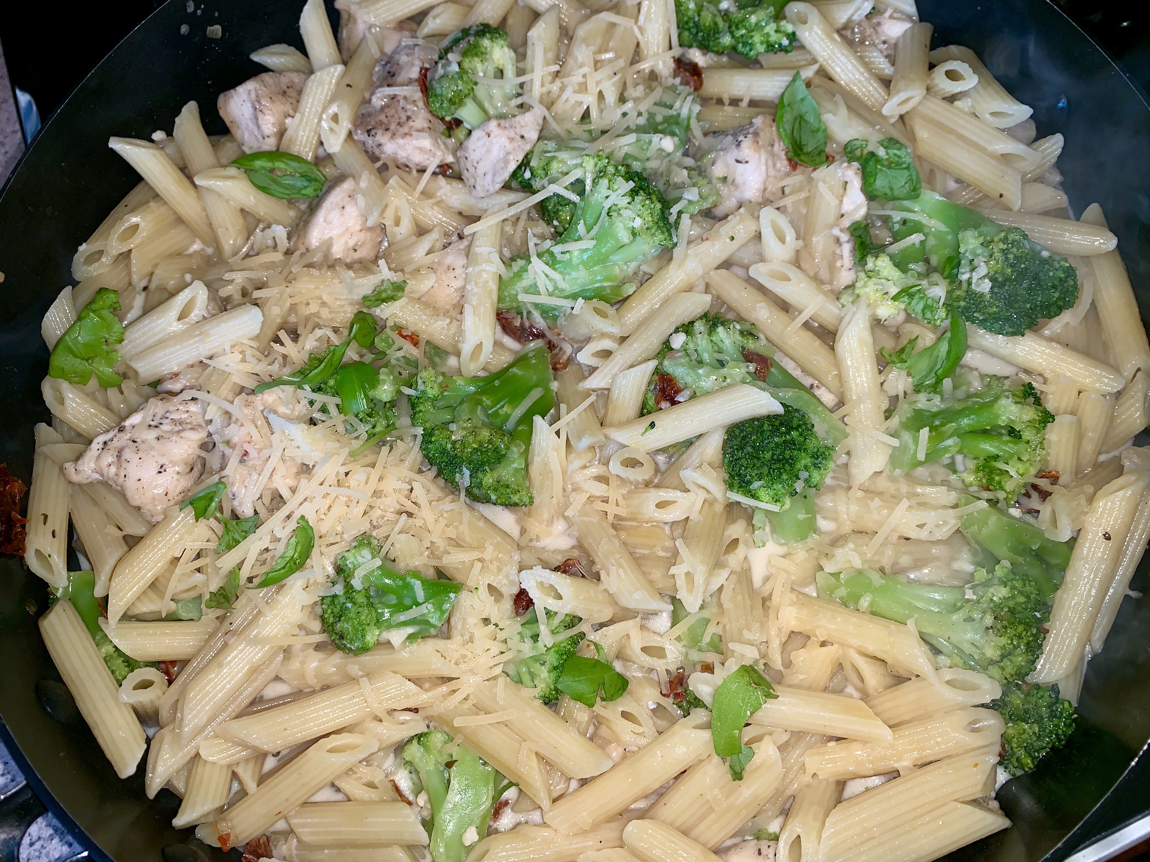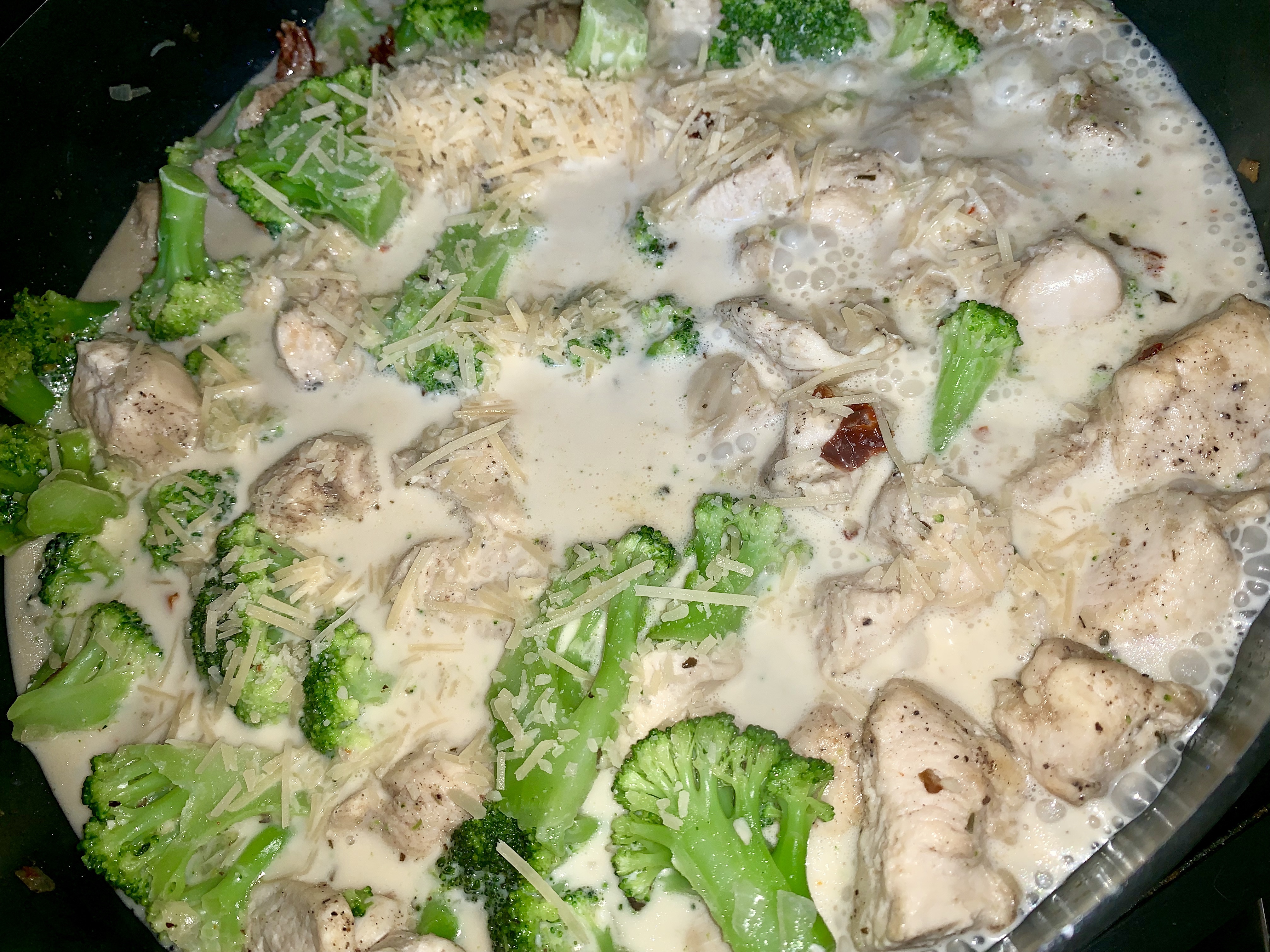 Once the chicken was cooked through, I added the chicken stock and brought it to a boil. Then added the bag of frozen broccoli and sundried tomatoes. I covered the pan allowing the broccoli to fully thaw out.