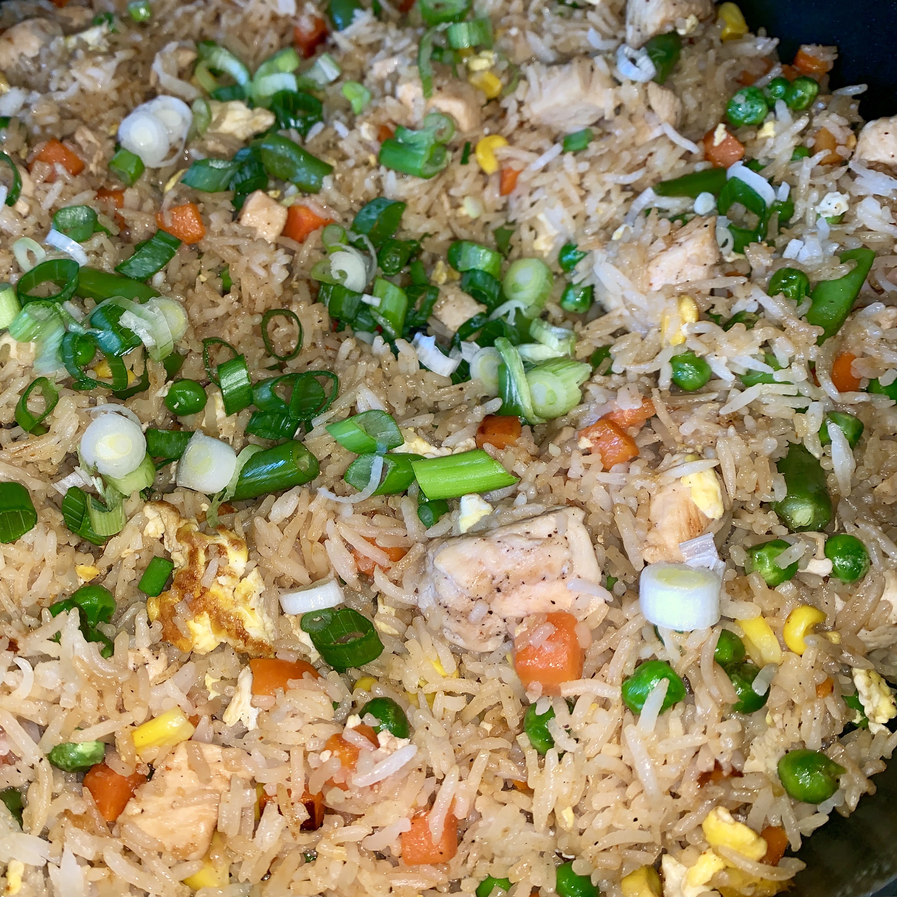 The ingredients were: chicken (only 1 large chicken breast!), jasmine rice, frozen mixed veggies, butter, sesame oil, soy sauce, oyster sauce, sriracha, egg, green onions and sesame seeds