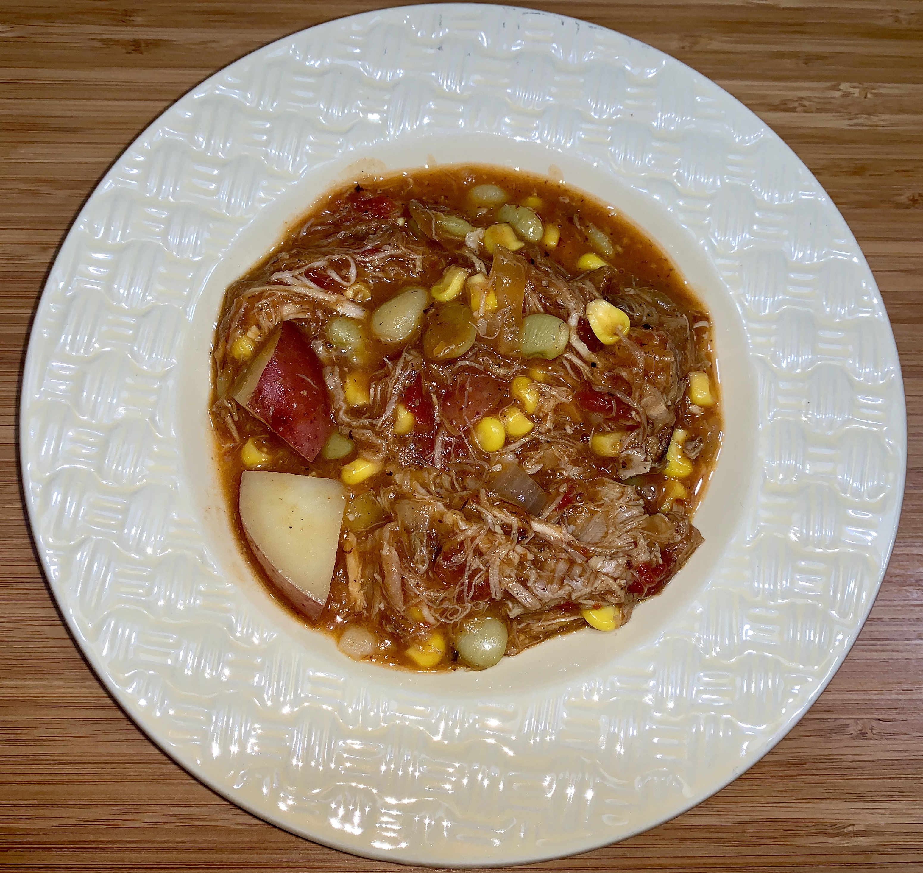 Then I added in the can of diced tomatoes, with the juice, vegetable stock, potatoes and seasonings and brought it up to a boil. I then, reduced the heat – covered the pot and simmered for 15 minutes.