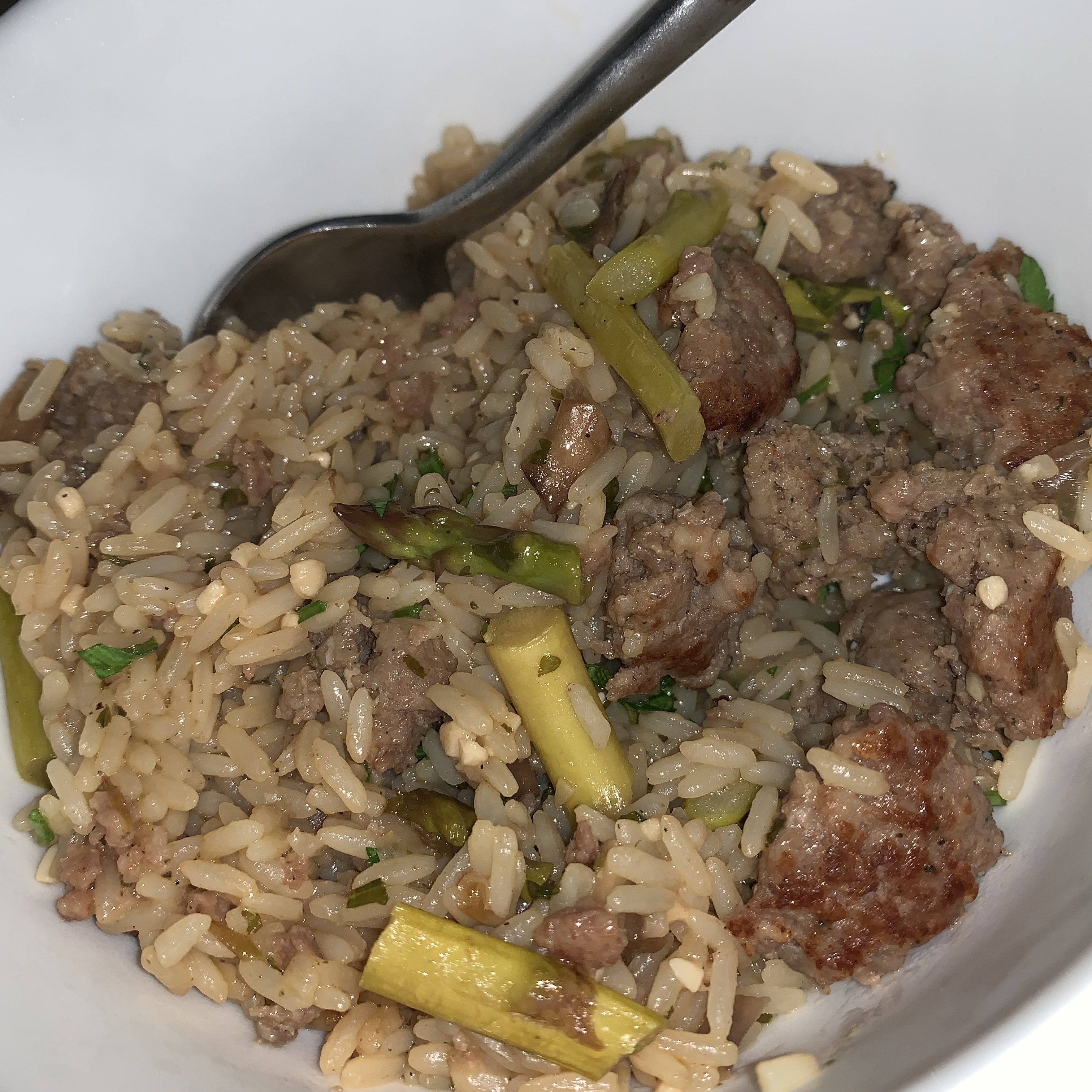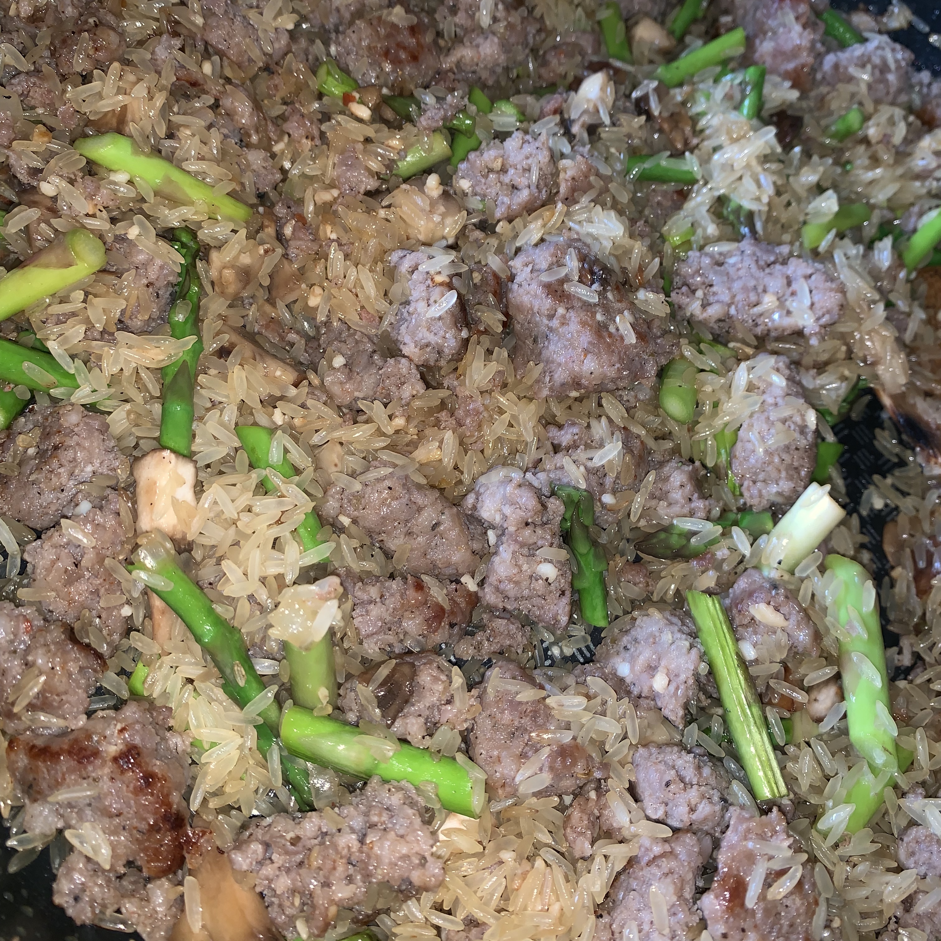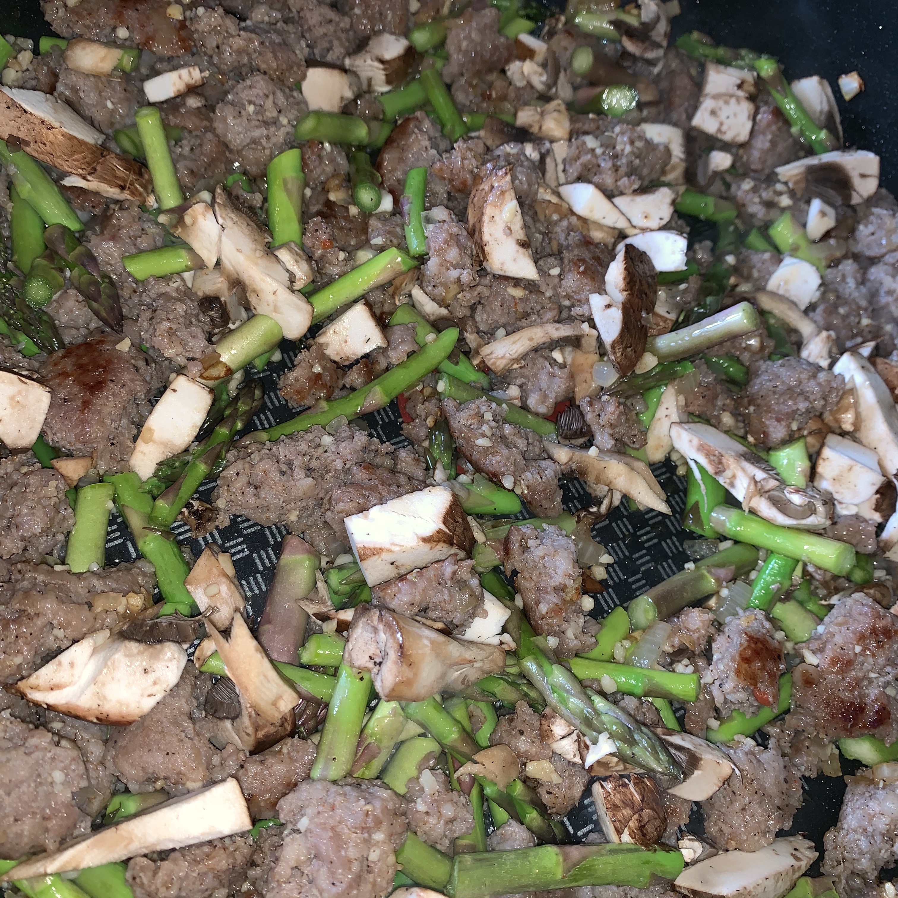 - Add in the asparagus and mushrooms (as well as salt and pepper) and saute vegetables for 8-10 minutes